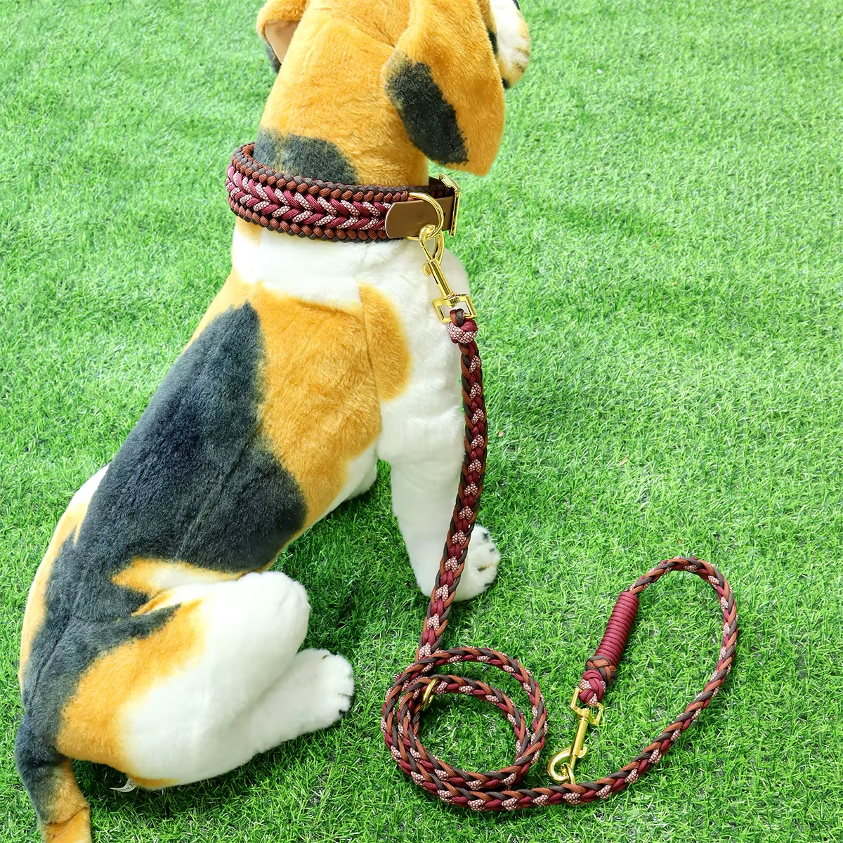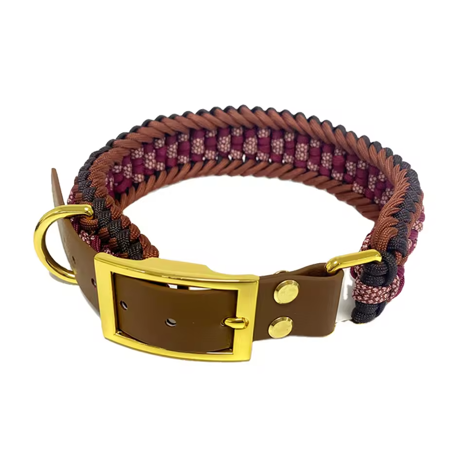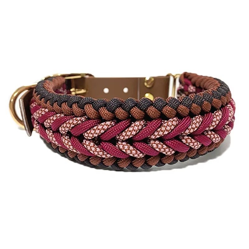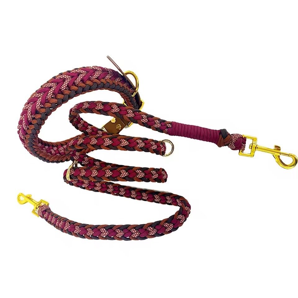 The Braided Burgundy and Pink Dog Collar and Leash Set is a coordinated two-piece kit constructed from woven cordage. The collar features a thick, multi-layered braid pattern in burgundy, dark brown, and pink, attached to an adjustable brown synthetic strap with gold-tone metal rivets and a buckle closure. The matching leash is formed from a rounded multi-color braid and includes a reinforced handle wrapped in burgundy cord. Gold-tone metal swivel snap hooks and integrated D-rings provide multiple attachment points for restraint and lead length adjustment. This set is designed for daily pet walking and manual control.