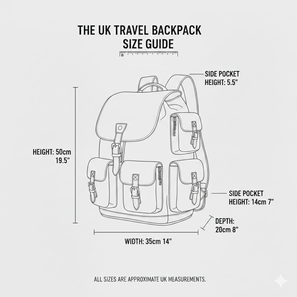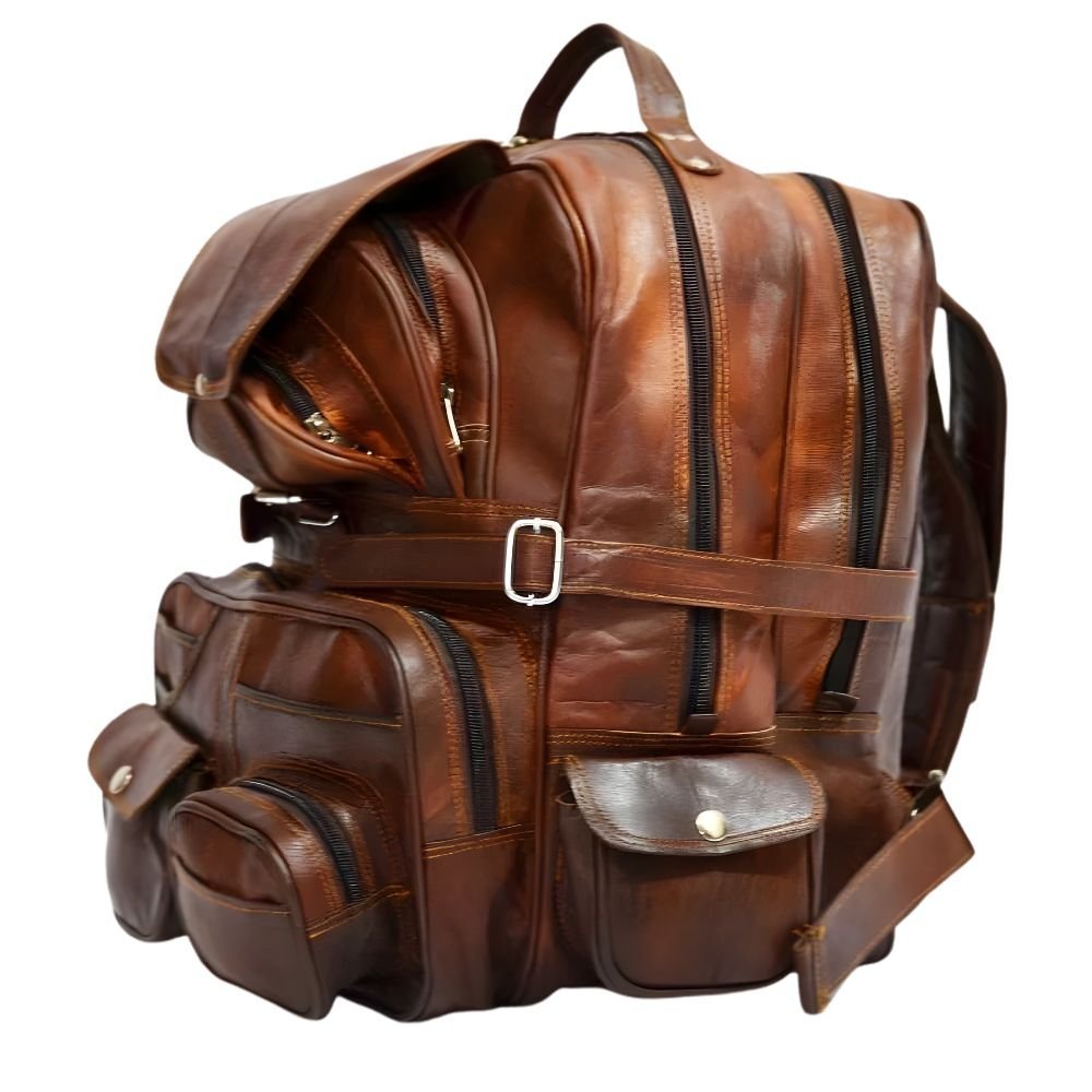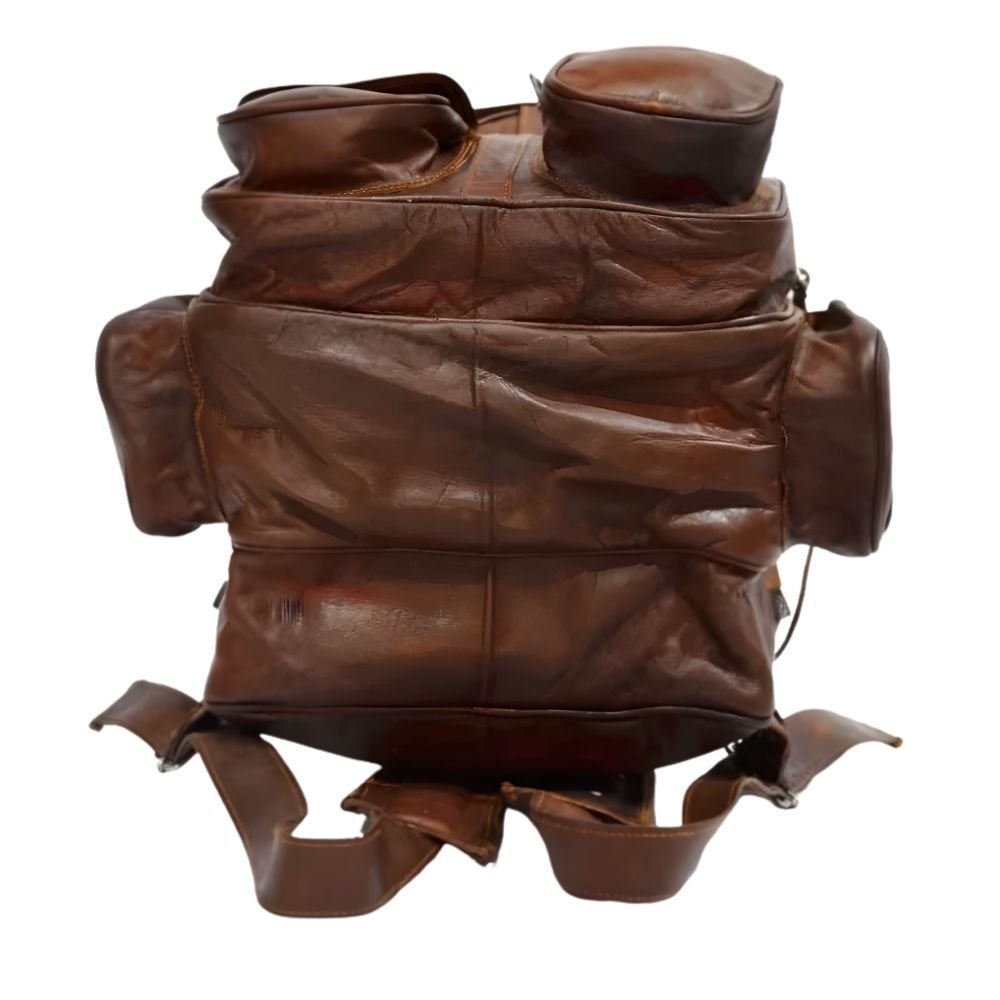A high-capacity leather backpack designed for travel and heavy-duty utility. This bag features a structured design with multiple external compartments, providing dedicated space for tools, electronics, and personal items.