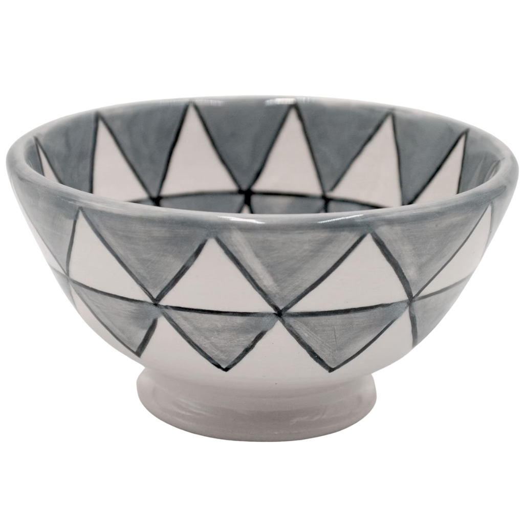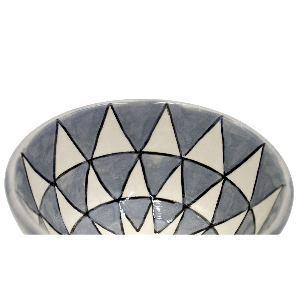 This ceramic bowl is handcrafted and hand-painted by Moroccan artisans in Fez, a city renowned for its distinctive blue and white pottery. The bowl features a traditional Art Deco triangle pattern with intricate geometric designs inspired by Moroccan and Islamic art.