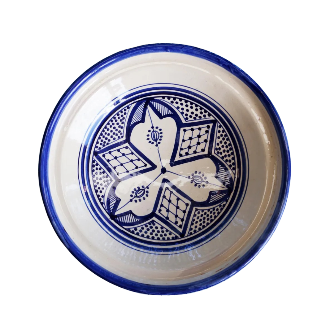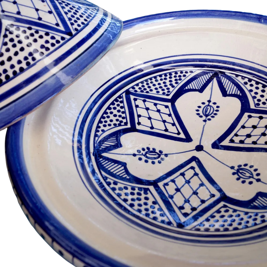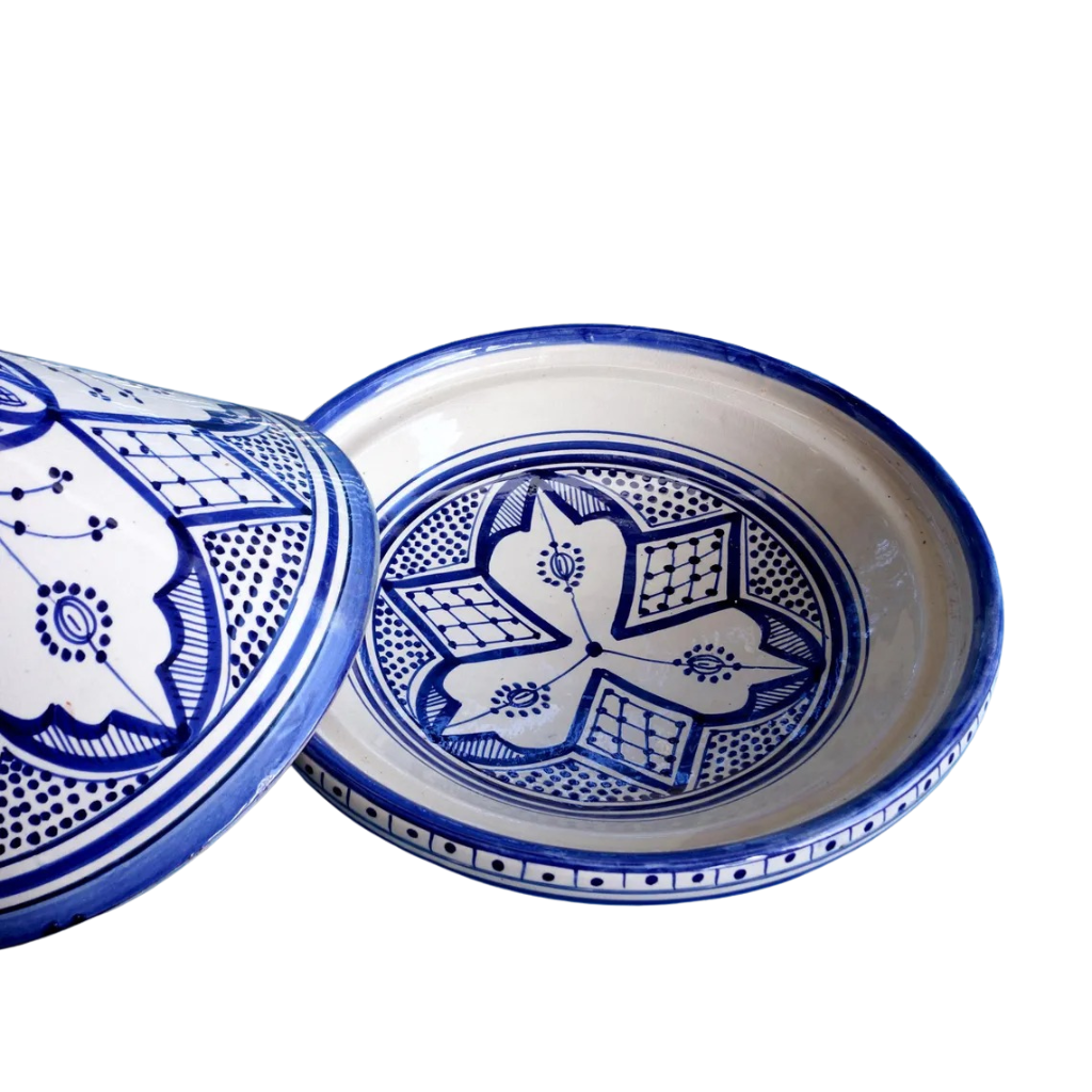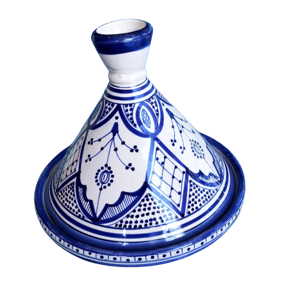This Moroccan ceramic tagine is handcrafted from clay and finished with a hand-painted blue glaze. Each piece is made individually by artisans, resulting in natural variations in color and decorative details.