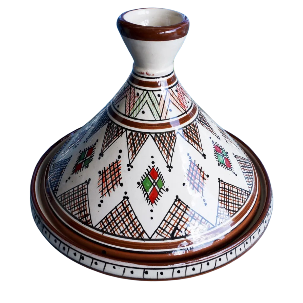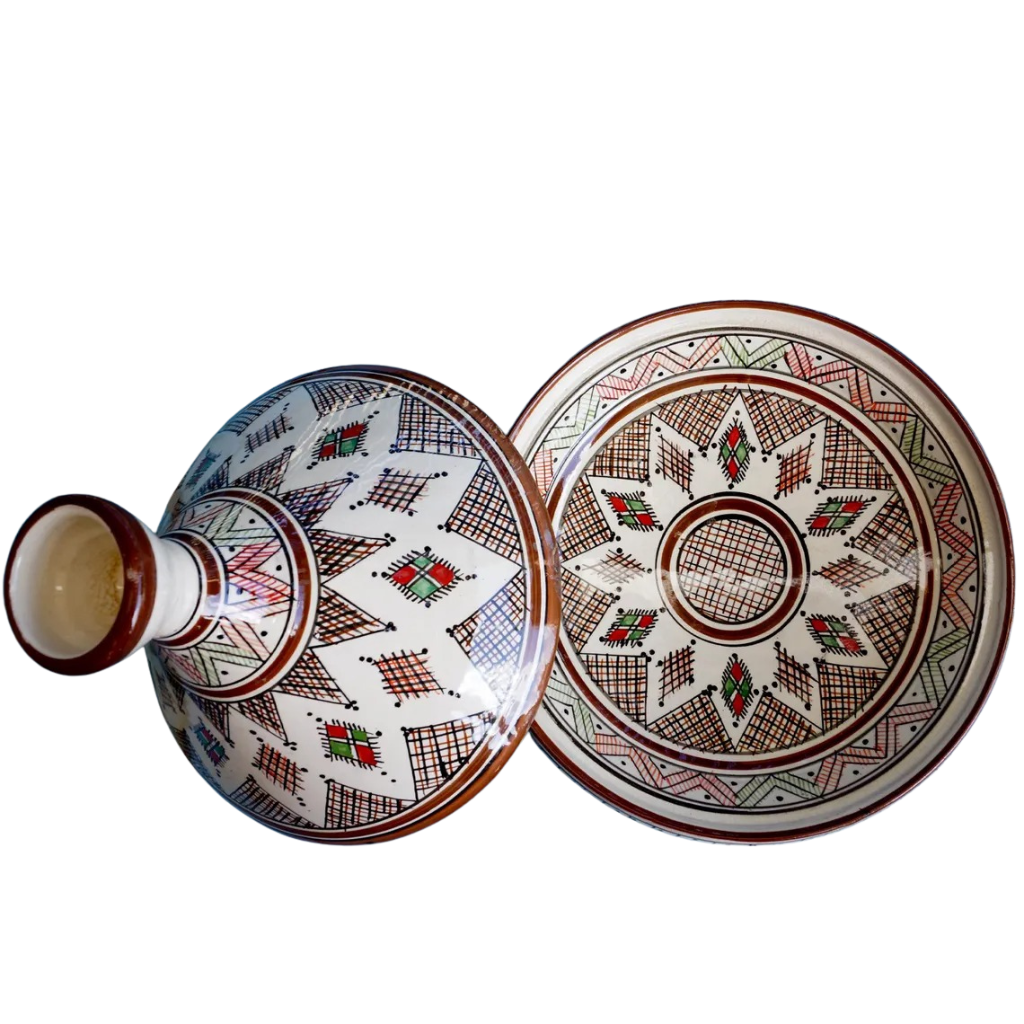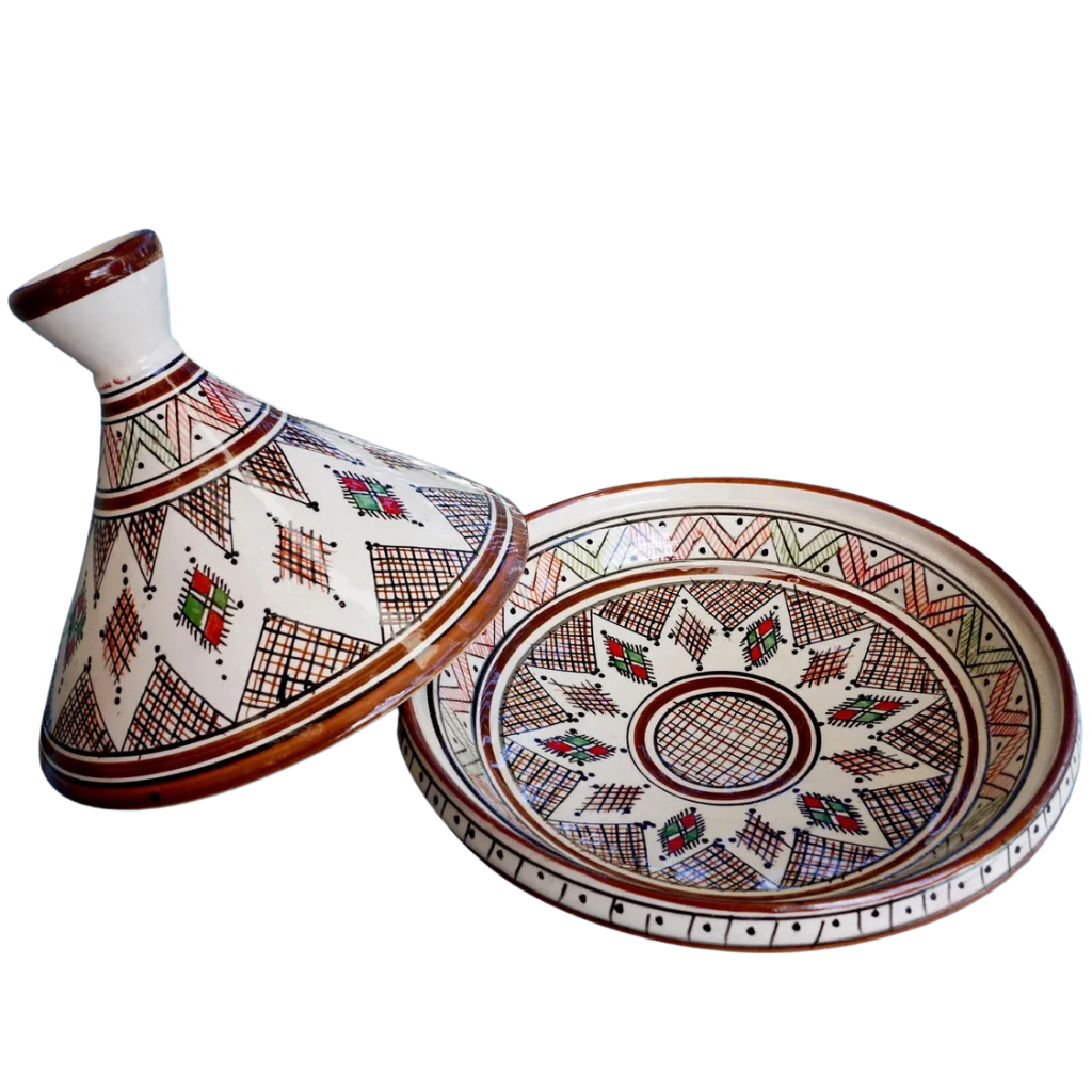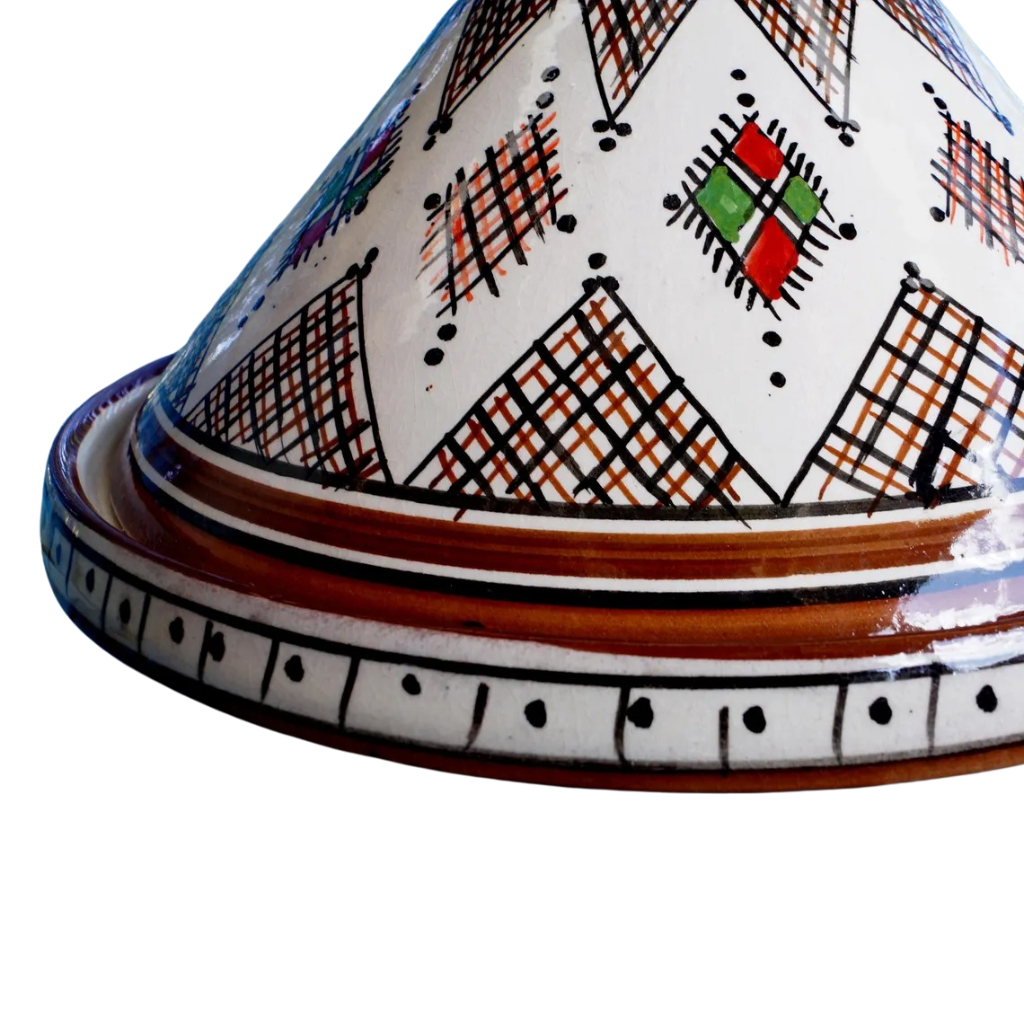 The tagine features a traditional conical lid and is intended for presentation and serving purposes only. It is suitable for displaying and serving prepared dishes but is not designed for stovetop or oven cooking.