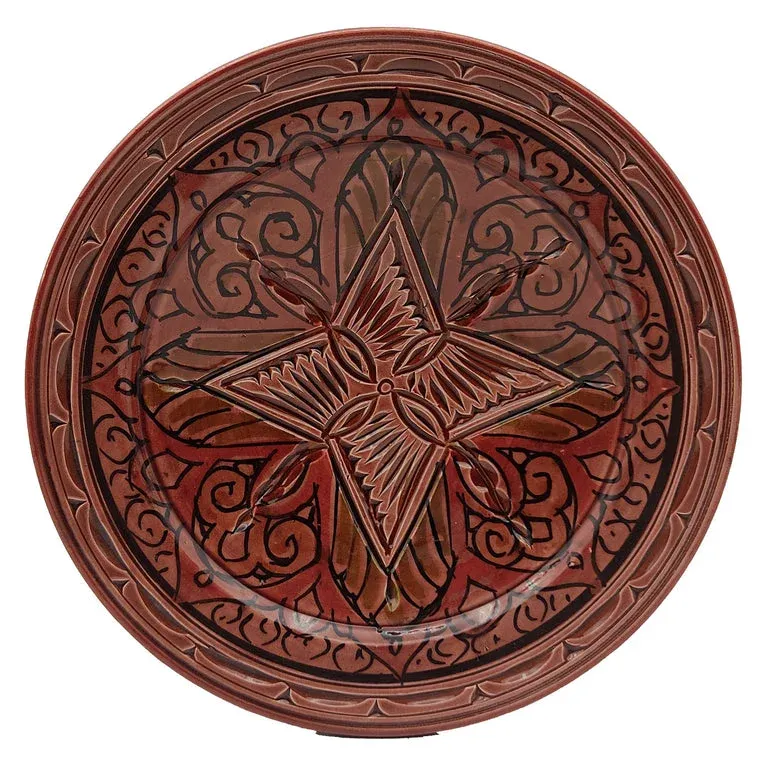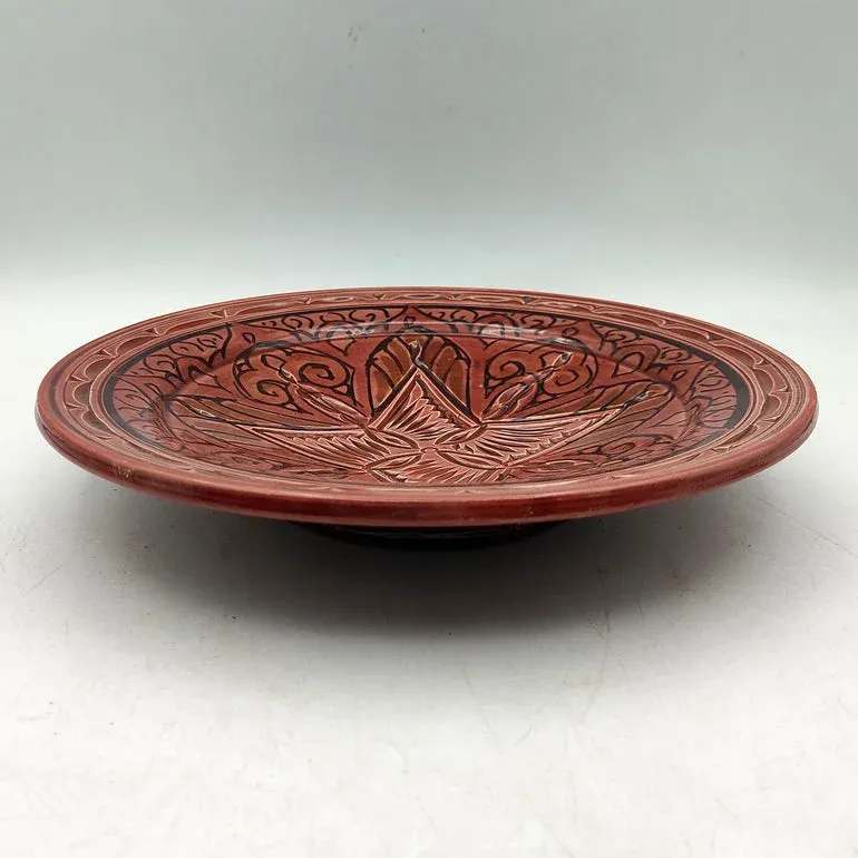 This handmade Moroccan ceramic plate is crafted by artisans in Morocco and features an intricate hand-painted design in red, black, and white tones. The patterns reflect traditional Moroccan decorative styles and are applied by hand.