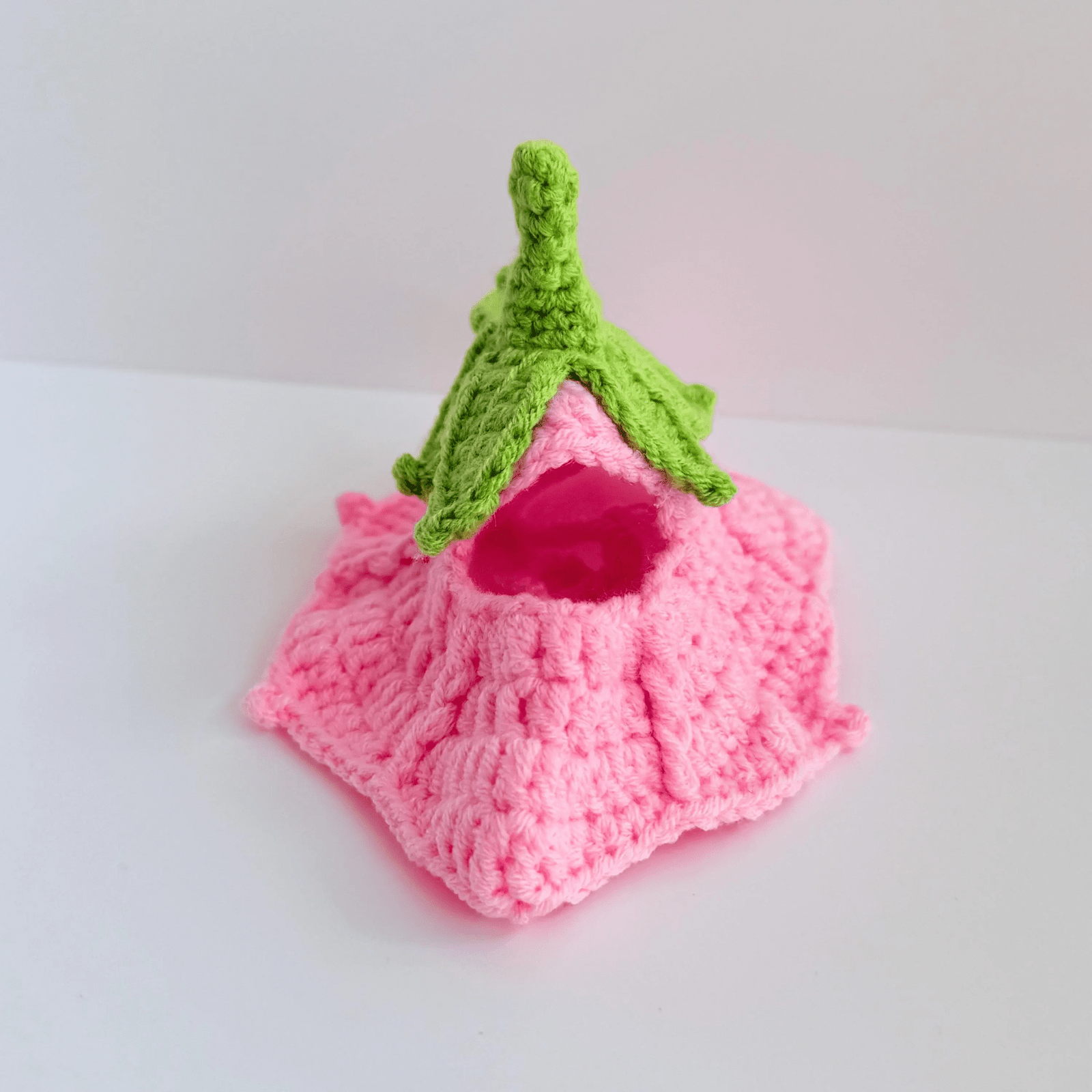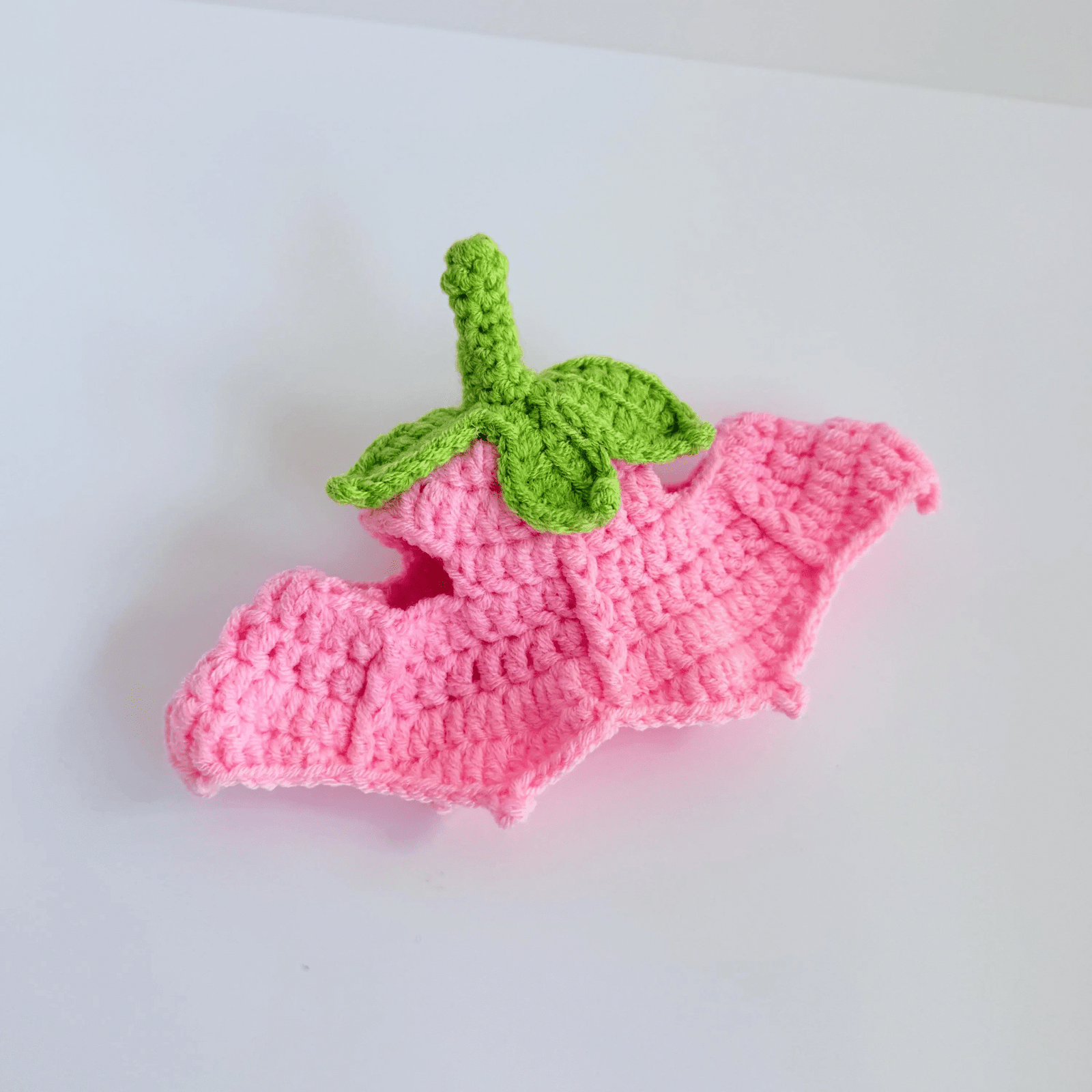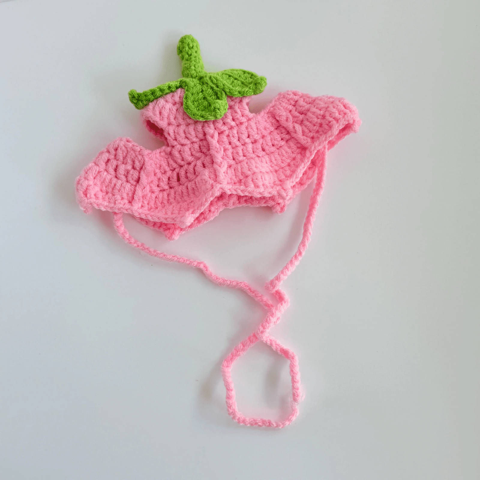 The Pink Crochet Strawberry Pet Hat features a pink yarn exterior with a textured strawberry-themed design and integrated green leaf accents on the top. Two pink crochet straps extend from the base to allow for manual fastening and placement on the pet’s head. The construction is handcrafted and includes two ear openings for fit. This accessory is intended for short-term wear during photography or themed events.